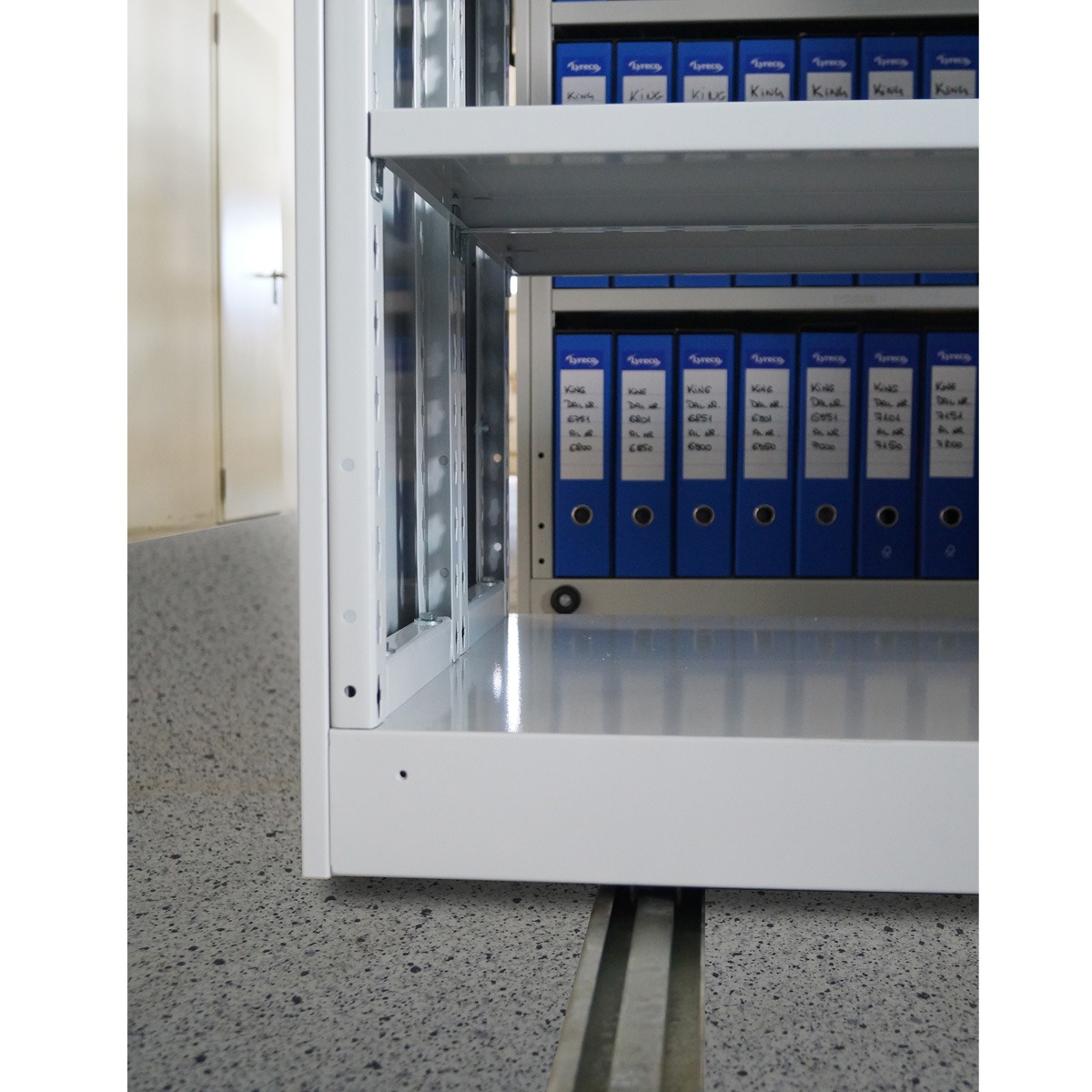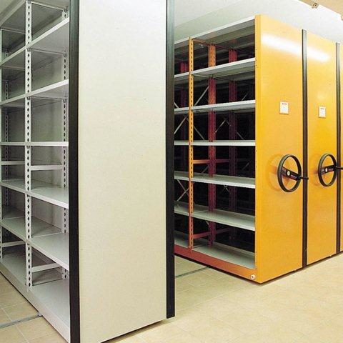 Die Regalwagen laufen leichtgängig auf einer im Boden integrierten oder am Boden aufgesetzten Schiene und sind leicht verschiebbar.